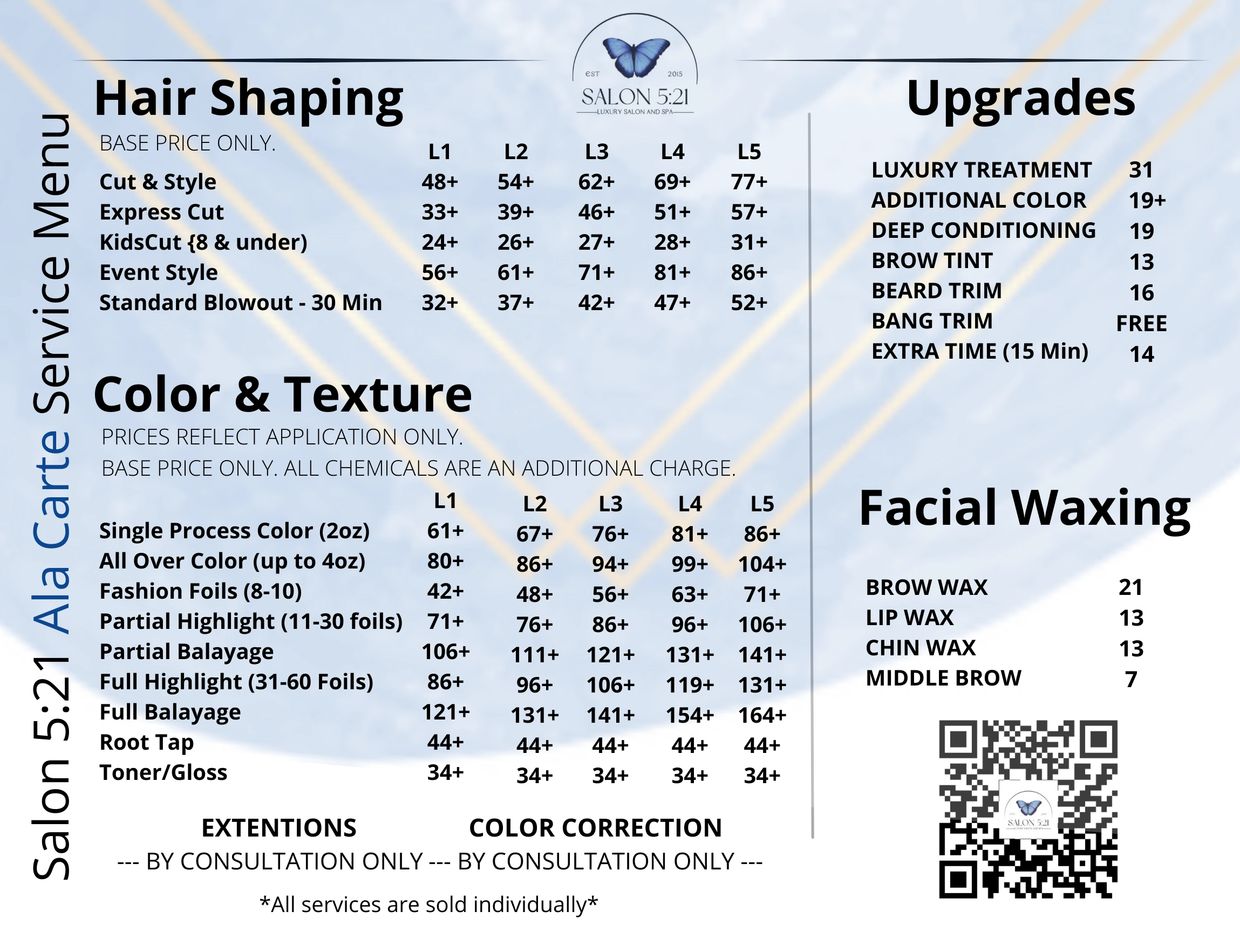 If you have a scheduled reservation for any service at Salon 5:21 and cannot make it, please call to let us know within 1 business day prior to your appointment. If you no show your appointment, you will be charged for 50% of the booked services at the end of that business day. The services will be based off the standard price of the services scheduled. If you have any questions, please feel free to ask. All credit cards used through our software will be encrypted and saved within our system. Thank you for your understanding.